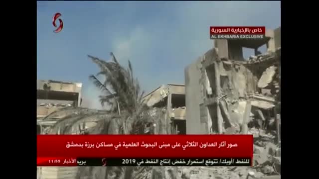 Телеканал Al Ekhbaria опубликовал кадры разрушений исследовательского центра в Сирии после ударов США и союзников.