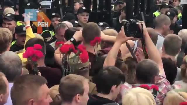 На кадрах ролика можно увидеть окровавленного мужчину, которому досталось в драке с радикалами. Его все еще пытаются утянуть за рукав в центр заварушки, однако неравнодушные люди выводят пострадавшего к медикам.