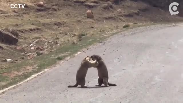 В Китае двое сурков устроили драку на дороге, мешая проехать автомобилистам.