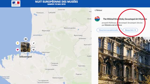 Как сообщает РИА "Новости", речь идет о карте музеев. На опубликованном скриншоте указан адрес Севастопольского художественного музея имени М.П. Крошицкого, а в подписи к нему отмечается, что Севастополь является российским городом.