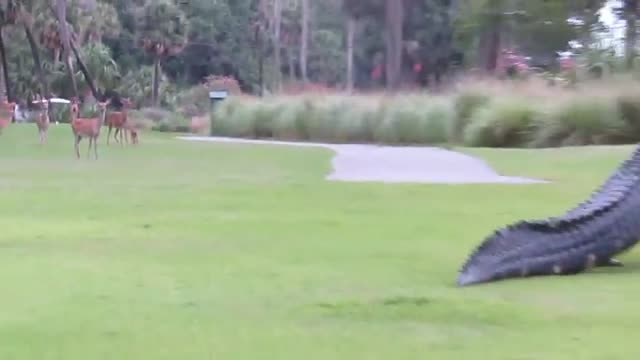 Гигантский аллигатор неспешно прошелся по полю для гольфа в городе Бофорт в американском штата Южная Каролина. В это время за ним с безопасного расстояния наблюдала группа оленей. Видео было размещено на одной из страниц в социальной сети Facebook. На необычную прогулку обратило внимание местное издание WQAD 8.