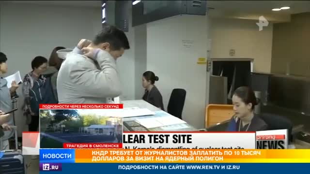 КНДР решила заработать на своем разоружении. С каждого журналиста, которого позвали на церемонию закрытия ядерного полигона, потребовали 10 тысяч долларов — якобы в качестве визового сбора. Несмотря на это репортеры уже находятся в аэропорту Пекина и готовятся вылететь в КНДР.