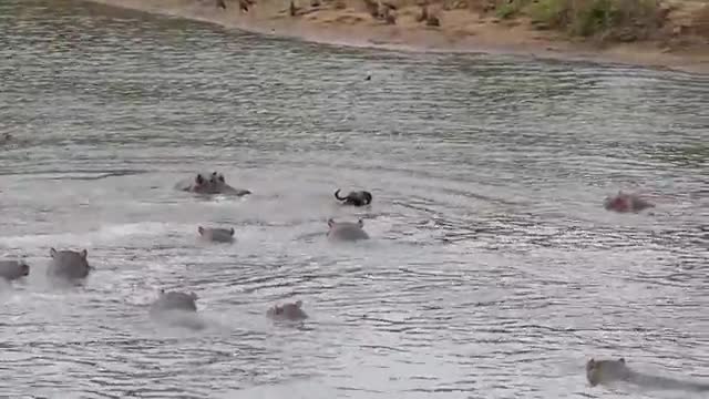 Однако их планам помешали бегемоты, которые находились неподалеку. Когда крокодилы находились рядом, массивные животные отогнали их от израненной антилопы гну.