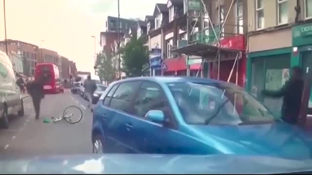 В Сети появилось видео, сделанное, по предварительной информации, в Лондоне. На кадрах записи видео, как в результате некоего дорожно-транспортного происшествия вспыхивает конфликт между велосипедистом и водителем легкового автомобиля.