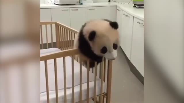 На этих кадрах можно увидеть, как черно-белый неуклюжий малыш повис на деревянном ограждении, не зная, как спуститься. Почти уже добравшись до пола, пушистый детеныш принимает решение залезть обратно в манеж.