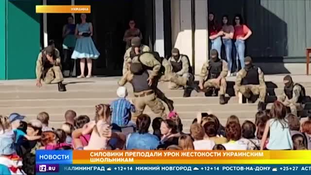 Урок жестокости преподали силовики украинским школьникам в День защиты детей. В городе Энергодар отряд спецназа устроил показательные выступления, во время которых один из бойцов достал нож и перерезал горло своему условному врагу.