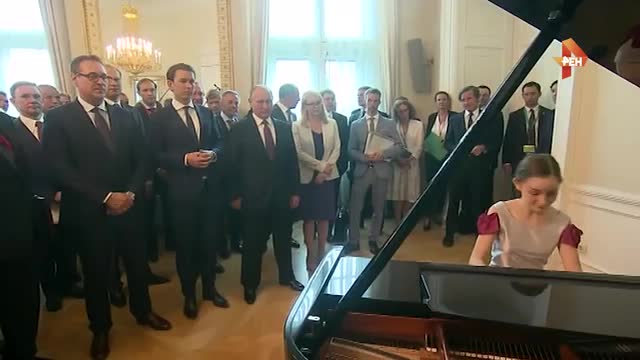 Президент России Владимир Путин и федеральный канцлер Австрии Себастьян Курц смогли насладиться композицией на тему "Подмосковных вечеров", которую исполнила 13-летняя пианистка Альма Дойчер.
