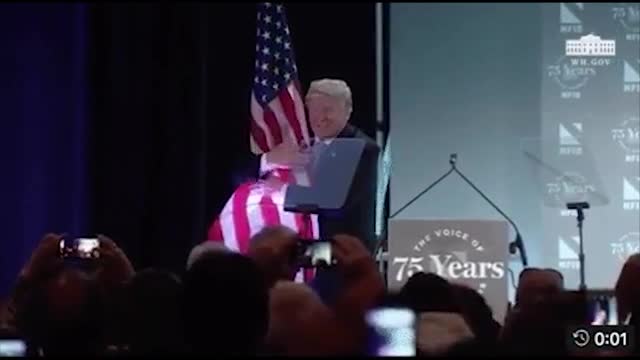 Американский лидер Дональд Трамп после своего выступления на мероприятии по случаю 75-летия Национальной федерации независимых предпринимателей крепко обнял флаг США. В Сети появилось видео, на котором это запечатлено.