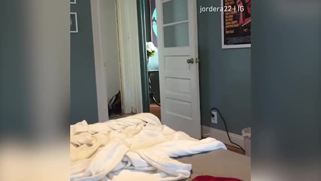 На этих кадрах можно увидеть, как хозяин животного совершает фокус: подбрасывает ткань на входе в комнату, прячется за ней и быстро убегает. Ткань падает на пол, и создается впечатление, что человек исчез.