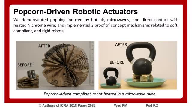 Инженеры из Корнелльского университета создали робота, работающего на новом виде топлива — поп-корне. Секрет состоит в том, что вода в зернах при нагревании превращается в пар.