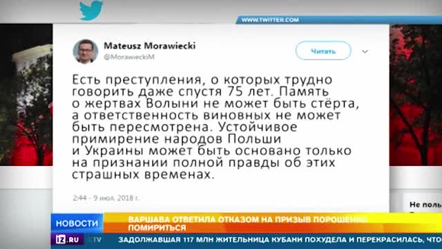Сегодня памятные шествия и митинги проходят по всей Польше - там вспоминают жертв Волынской резни. 75 лет назад украинские националисты устроили настоящий геноцид - погибли более ста тысяч мирных жителей. Премьер Матеуш Моравецкий в Twitter написал, что примирение польского и украинского народов возможно только после признания правды о событиях тех времен.