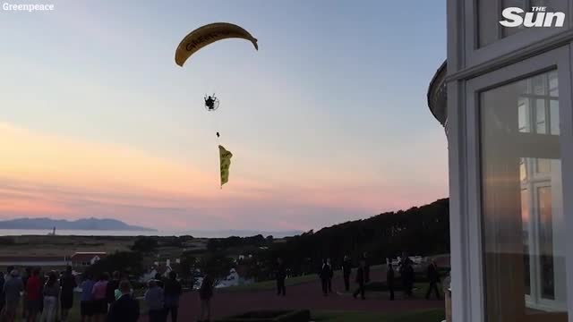 Активист "Гринписа" переполошил охрану американского президента Дональда Трампа, когда пролетел практически над головой политика на его поле для гольфа в Шотландии.