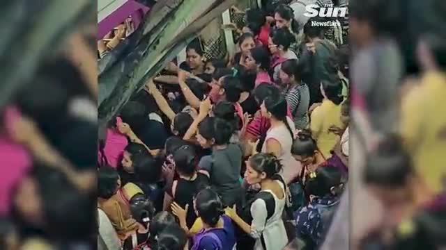 Грандиозная давка образовалась на одной из станций метро в индийском Мумбаи. Пассажирам пришлось отчаянно бороться не только за возможность сесть в поезд, но и выйти из него. Шокирующее видео публикует британский таблоид The Sun.