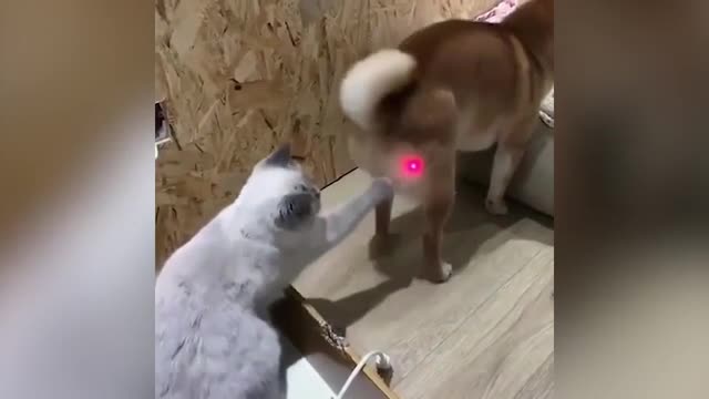 Видео: хозяева навели лазерную указку на зад собаки, и кошка на это отреагировала