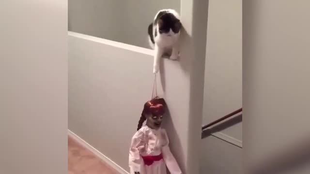 Судя по этим кадрам, животное пыталось подцепить куклу лапой. Однако когти питомца застряли в волосах игрушки. Кошка осталась сидеть с куклой, которая "повисла" у нее на лапе.
