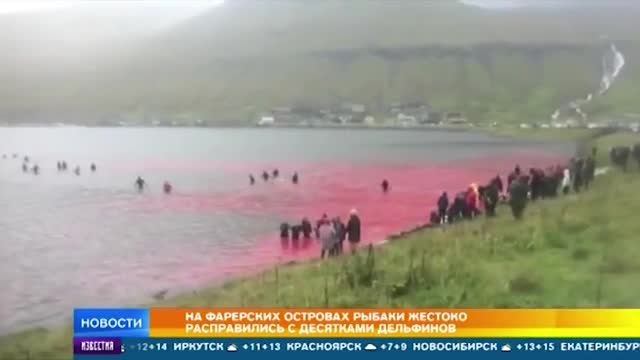 Рыбаки загнали на мелководье и хладнокровно убили около сотни особей. Зоозащитники требуют запретить такую рыбалку — за год из-за этого погибает не меньше тысячи дельфинов. Но правительство отказывается что-либо делать.