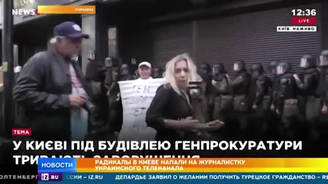 Разорвать сотрудничество с Россией лично от генпрокурора Луценко в эти минуты требуют националисты в Киеве. Радикалы забрасывают камнями здание Генеральной прокуратуры, вот-вот начнется штурм! Под горячую руку националистов из группировки С-14 попала журналистка, которая вела прямое включение. Корреспондентке телеканала NewsOne Дарине Билере едва не проломили голову. Сначала бросили в девушку кусок льда и несколько яиц, а затем нанесли удар.