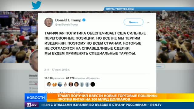 Американский лидер вновь озвучил свою угрозу, что если КНР примет ответные меры, то американская администрация "незамедлительно перейдет к третьему этапу — введению пошлин на дополнительный импорт стоимостью порядка 267 миллиардов". В этом случае под пошлины попадут все импортируемые в США товары из КНР. Ранее Белый дом ввел 25%-ные пошлины на китайский импорт стоимостью 50 миллиардов долларов. Китай зеркально ответил на эти действия.