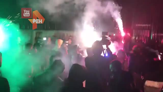 Участники стихийного митинга зажгли файеры, а также разрисовали забор дома различными надписями.