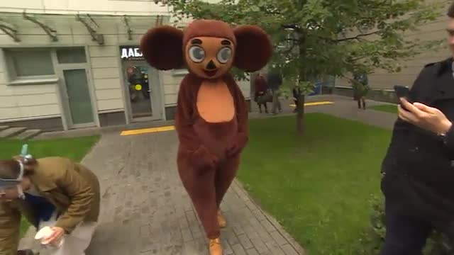 Перформанс у здания во 2-м Сыромятническом переулке устроили люди в костюмах медведя и Чебурашки. По их мнению, только распитие "Новичка" может помочь россиянам получить пропуск в Соединенное Королевство.