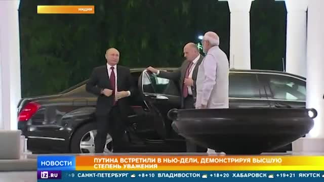 В аэропорт Нью-Дели борт номер один из Москвы прибыл несколько часов назад. Российского президента у трапа встретила министр иностранных дел Сушма Сварадж, одетая в яркое сари золотистого цвета. Она проводила гостя вдоль роты почётного караула, представленной сразу тремя родами войск – это подчеркивает степень высшего уважения.