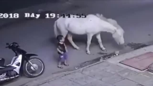 В Сети набирает популярность видео, на котором маленький мальчик толкает и пристает к лошади, мирно стоящий у дороги одного из вьетнамских городов. В какой-то момент животное не выдерживает и бьет копытом мальчика, который отлетает к стоящему рядом скутеру, получая тем самым еще один удар.
