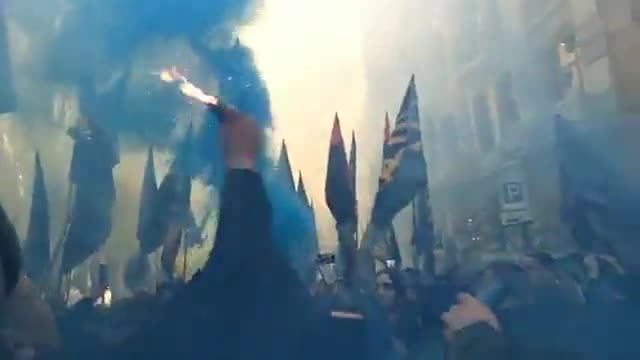 Несколько тысяч представителей ультраправых украинских организаций прошли маршем по центру Киева и зажгли файеры и дымовые шашки на Бессарабской площади.