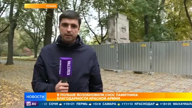 Спор возник на фоне событий в Варшаве. Там уже пятый день пытаются снести памятник Благодарности Красной армии. Рабочие никак не могут извлечь центральную плиту с изображением красноармейца для того, чтобы формально ее сохранить. Им уже удалось обезобразить памятник, но барельеф советского солдата не поддается.