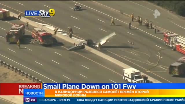 Одномоторный самолет с символикой люфтваффе на крыльях упал на шоссе номер 101 в Калифорнии. Видео горящего самолета разместила на своем сайте телекомпания KTLA.