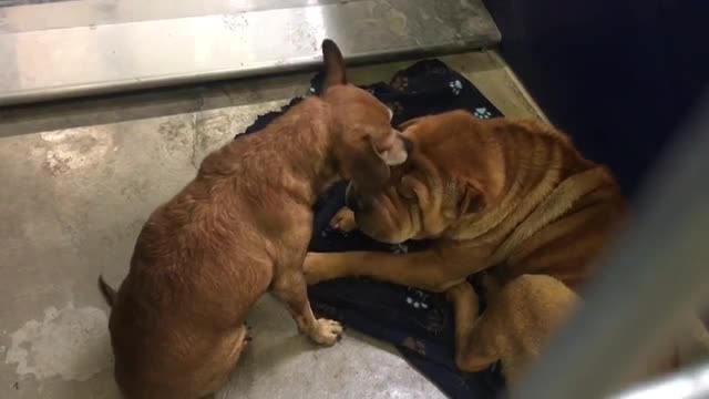 Работники приюта полагают, что собаки и раньше жили в одном доме. Однако за месяц пребывания в приюте за ними так никто и не пришел. При этом шарпей не только ничего не видит, также у него случаются судороги и ему требуется по-настоящему заботливый хозяин. Тому, кто решится на такой поступок, придется забрать из приюта обоих псов, поскольку они просто не смогут прожить друг без друга.