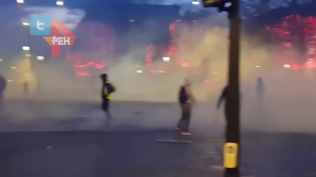 Манифестанты зажигают дымовые шашки, стреляют в служителей правопорядка фейерверками и жгут машины на улицах.