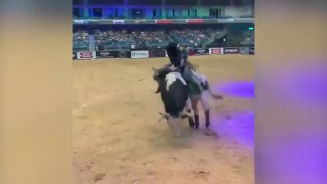 На кадрах видно, как в начале выступления он ловко держится на быке, в какой-то момент животное сбрасывает его, наездник встает на ноги и в этот момент получает удар задними копытами по грудной клетке.