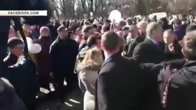 Как видно на опубликованных в Facebook кадрах, украинский лидер радостно приветствует публику и обменивается с украинцами рукопожатиями. В какой-то момент любовь к народу выходит из-под контроля. Порошенко наклоняется к одной из женщин в толпе, чтобы поцеловать. Однако та явно не ожидала такого "теплого приветствия" и проигнорировала его.