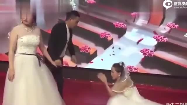 На кадрах видеозаписи запечатлено, как китаянка стоит на коленях в подвенечном платье и кричит о том, что допустила ошибку. Все происходит на глазах у невесты мужчины, с которой он должен был поцеловаться.