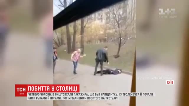 В Киеве четверо молодых людей вытолкали мужчину из троллейбуса и избили его, очевидцы засняли произошедшее на камеру, передает ТСН.