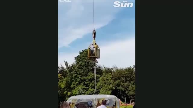 На кадрах видно, как мужчина летит со страховкой вниз. В какой-то момент он отцепляется от веревки и падает с большой высоты на подушку. По данным The Daily Star, потерпевший упал с высоты 100 метров.