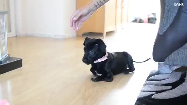 Собачка появилась на свет с дополнительной парой передних лапок, а потому передвигаться щенку довольно трудно, и делает это он прыжками, как кенгуру.