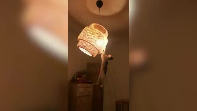 На кадрах видно, как усатый висит у самого потолка на люстре. Интернет-пользователи предположили, что он захотел стать мотыльком, а потому полетел на свет, как насекомое.