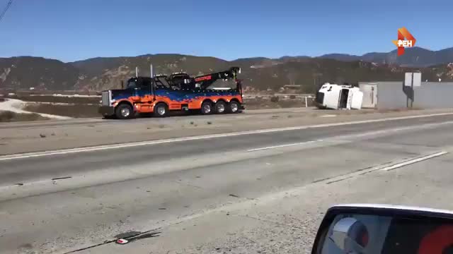 Инцидент произошел в районе Лос-Анджелеса накануне. Порывы ветра были такой силы, что большегрузы опрокинулись. Известно, что скорость ветра в некоторых районах Калифорнии превысила 80 км/ч.