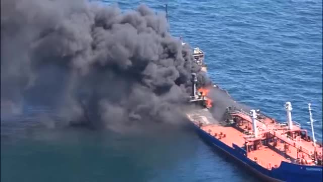 В Сети обнародовано видео с российским танкером, который загорелся в Каспийском море. Информация о пожаре на судне Palflot 2 появилась в 9:30 по московскому времени. Танкер горел в территориальных водах Туркменистана на границе с Азербайджаном.