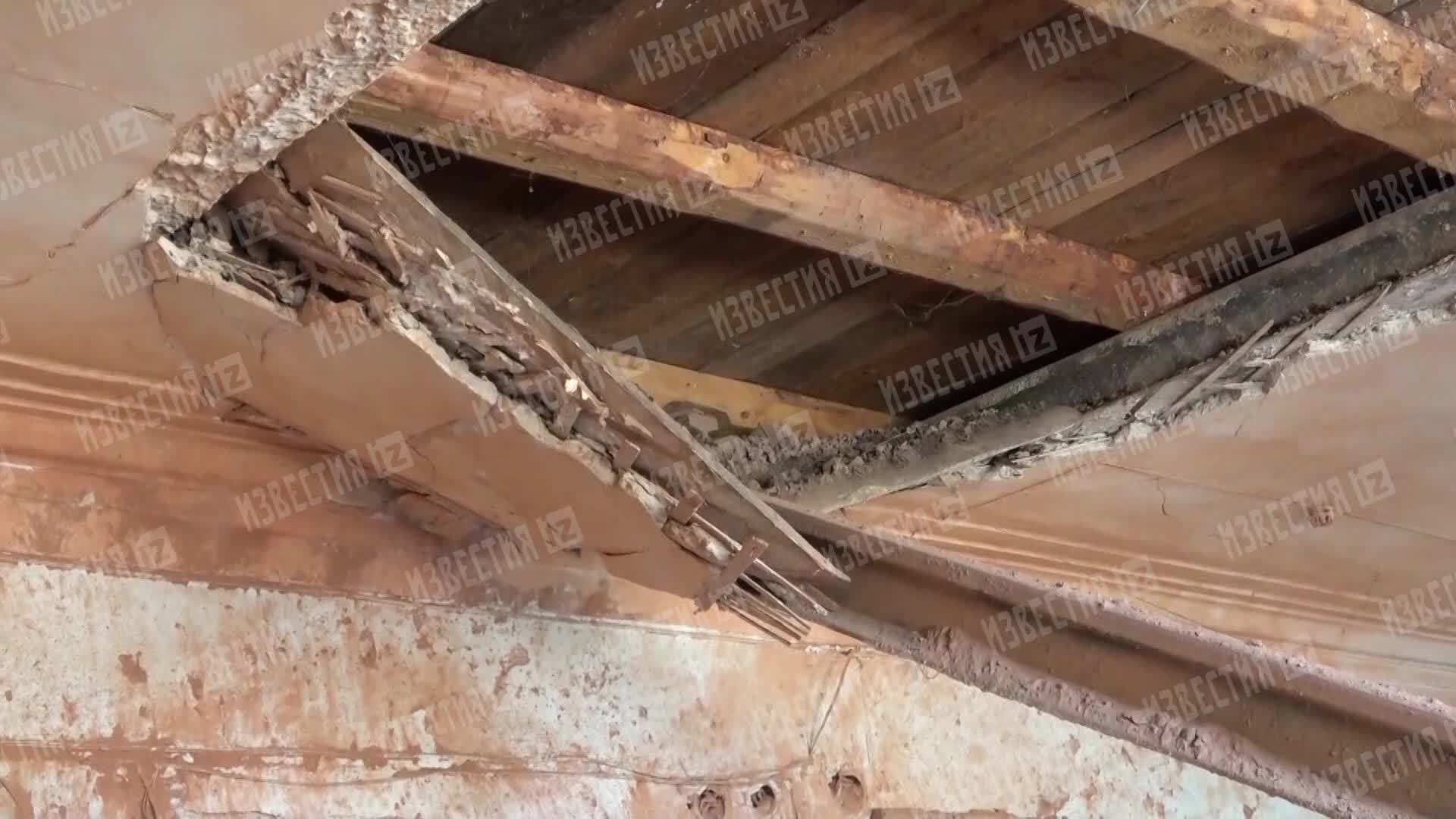 Кадры сделаны внутри здания, где выбиты стекла, обрушен потолок, разбросаны кирпичи и осколки.