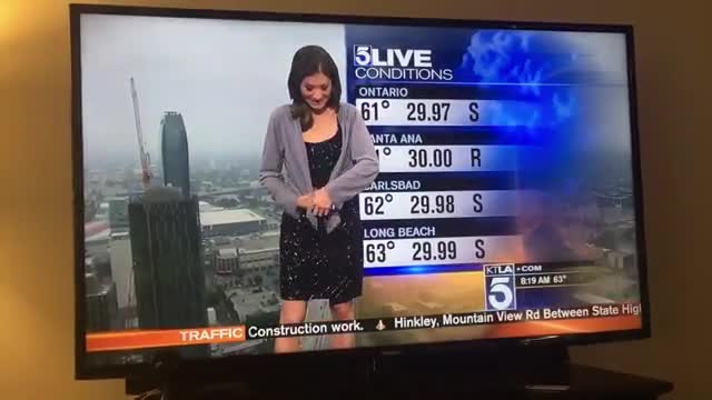 Ведущая прогноза погоды на американском телеканале KTLA смутила своим откровенным платьем коллег в прямом эфире. Либерта Чан работала в студии. В какой-то момент в кадре появилась рука, держащая накидку.