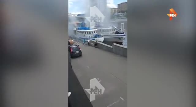 Появилось видео пожара на борту корабля у комплекса "Москва-Сити". Судя по кадрам, возгорание произошло в помещениях машинного отделения. На палубе работают спасатели и ликвидируют источник пожара.