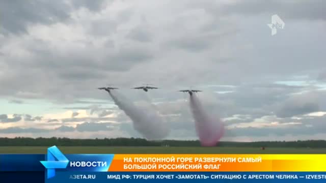 В Москве на Поклонной горе накануне празднования Дня России в ходе патриотической акции развернули самые большие флаг России и Знамя Победы.