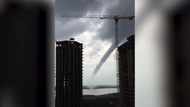 Жители Сургута сняли на видео торнадо. Вихрь пронесся вдоль берега Оби над самой водой, а затем поднялся выше.