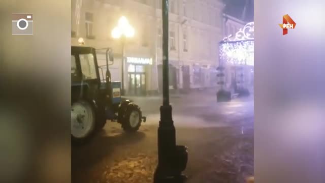 Москвичи сняли на видео, как коммунальщики во время урагана поливают дороги