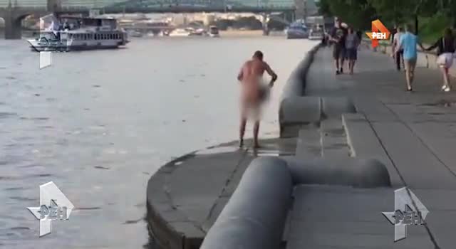 Очевидцы сняли на видео, как нагой мужчина искупался в Москве-реке. Инцидент произошел в центральной части города.