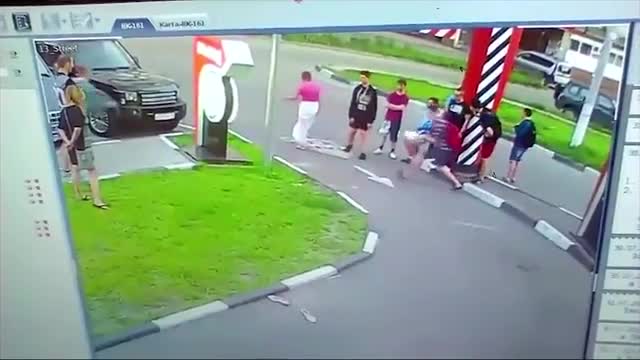 В какой-то момент стоящий в стороне молодо человек по непонятной причине бьет ногой в установленный неподалеку стеклянный рекламный стенд и разбивает его.