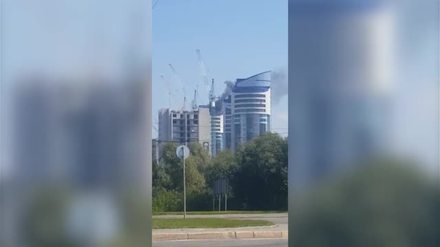 Как видно на кадрах видео, дым идет из окон квартиры на одном из верхних этажей.