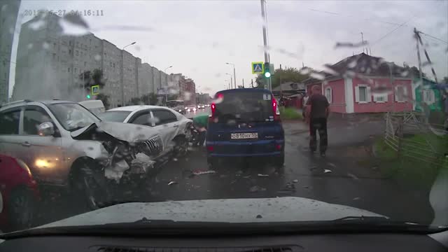 Регистратор снял, как водитель "Лады" врезался на полном ходу в стоящие на светофоре машины